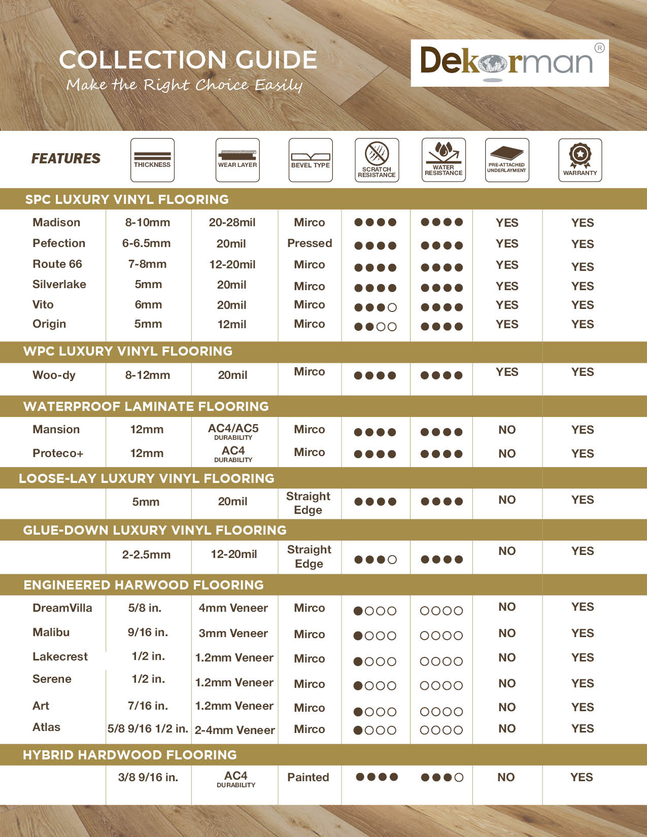 The pressed bevel luxury vinyl plank from the Perfection Collection by Dekorman Flooring is notable for its U-shaped beveled edges, making it exceptionally easier to clean. These high-quality planks are designed for simple installation, are 100% waterproof, and very easy to maintain, making them the perfect solution for areas susceptible to spills. With these planks, you get the beautiful look of real hardwood without the worry or maintenance hassle. Embrace the convenience and durability of these floors, confident that they can handle daily life's challenges with grace.