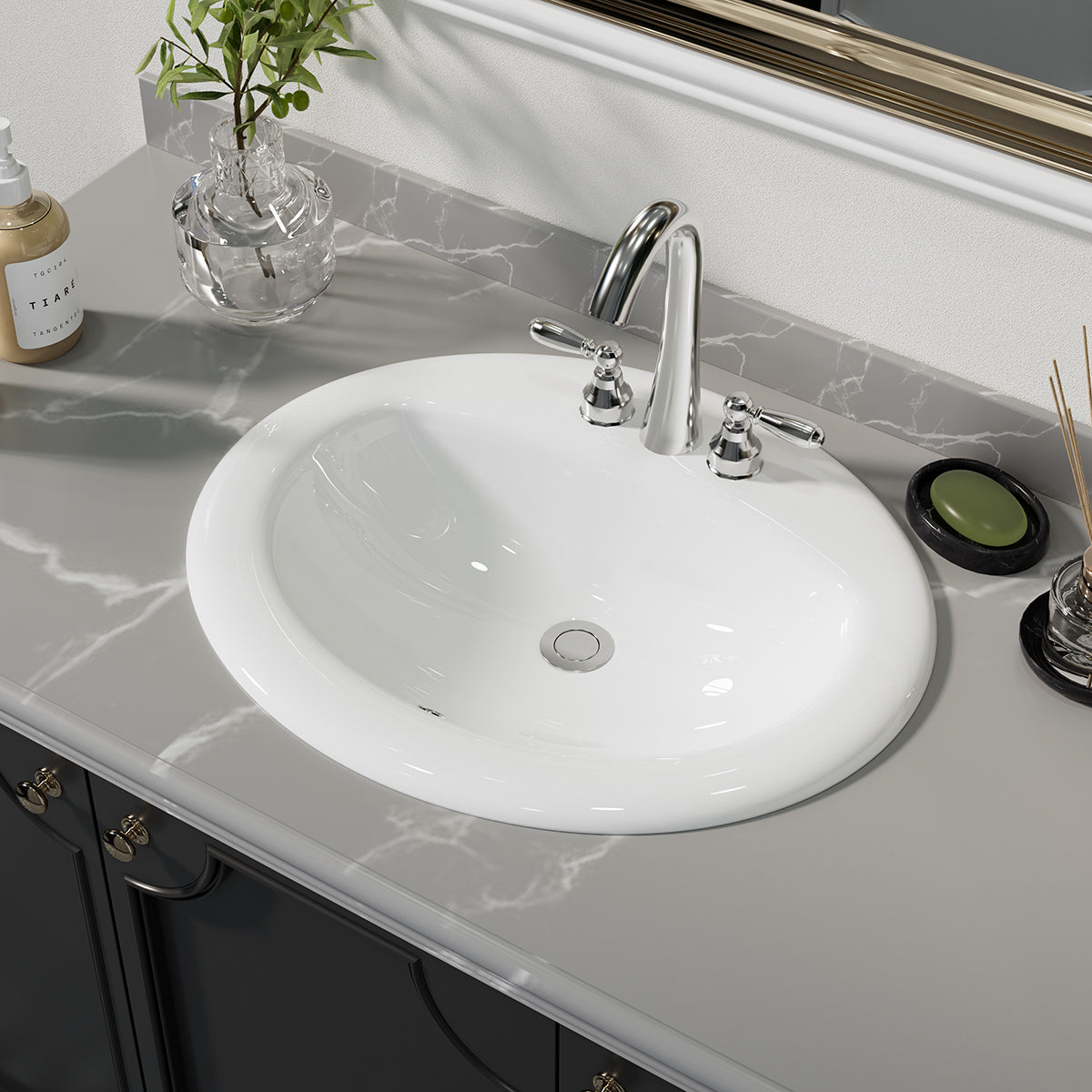 • Drop in lavatory pre-drilled 4 in. faucet holes, equipped with concealed front overflow